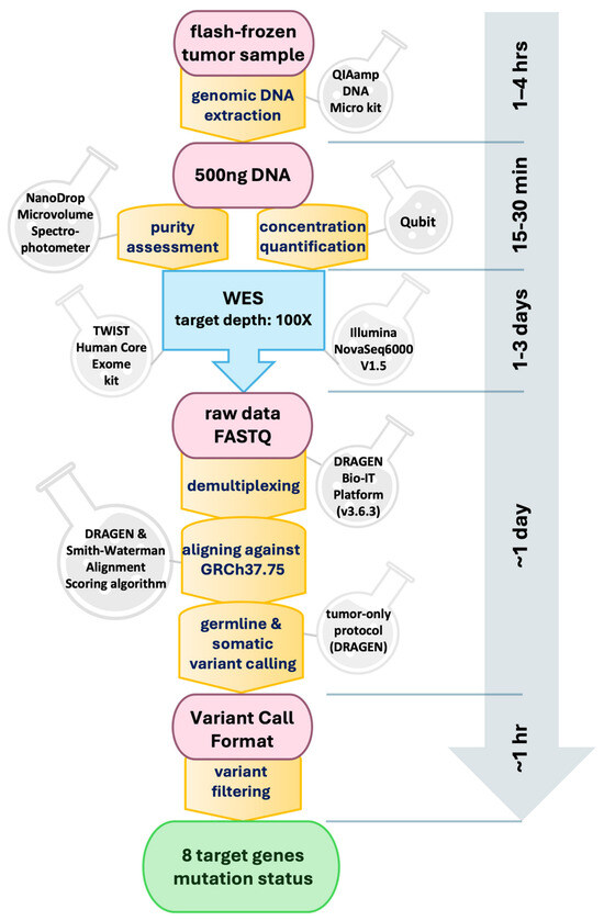 Schematic representation of the biopsy analysis pipeline with whole-exome sequencing (WES) and subsequent bioinformatic analysis. Time estimates for each step are indicated along the vertical axis.