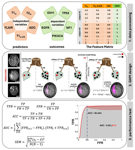 To analyze the impact of combined MR contrasts as predictors alongside each contrast separately, we prepared a total of 31 feature matrices categorized into five groups based on the number of contrasts: single, double, triple, quadruple, and quintuple (or all contrasts). Step 2 in Figure 3 provides an architectural visualization of gradient boosting in GAM as a sequential ensemble, using an example of triple contrast (T1W, T2W-FLAIR, and ADC) for predicting EGFR mutation status. The general form of a GAM can be expressed with a univariate shape function [30]: