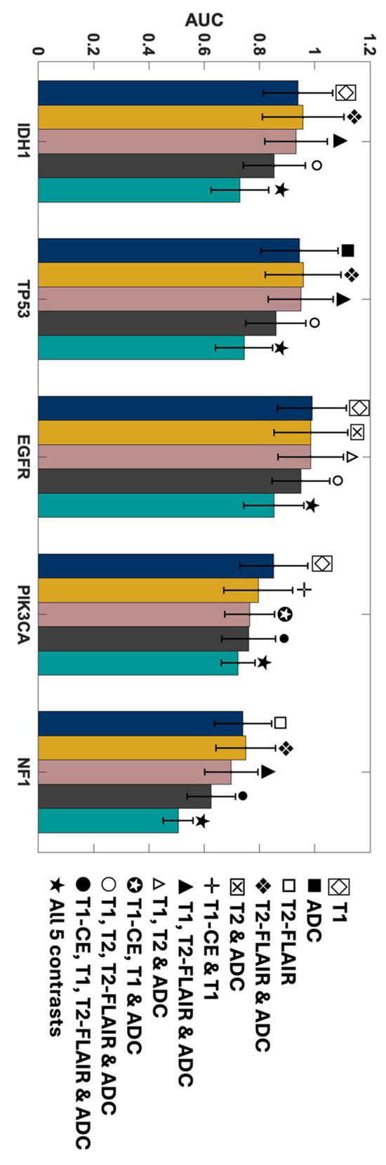 AUC scores of the MRI contrast combinations with the highest mean AUC scores in each group for predicting each mutation status. The SEM bars are indicated on top of each predictor. Navy represents single contrasts, mustard for double contrasts, pink for triple contrasts, smoke for quadruple contrasts, and teal indicates quintuple contrasts.
