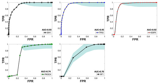 In this work, the ability of individual MR contrasts to predict genomic features in glioma was assessed by conducting ROC analyses. The observed average ACC values for FPR of 0.2 ranged between 0.71 and 0.83, indicative of statistical robustness. The AUC scores for each of the 31 combinations pertaining to each genetic target are detailed in Figures S2–S6 in the Supplementary Materials. Figure 4 displays the predictor combinations yielding the highest mean AUC scores within each group for each mutation status with their SEM (standard error of the mean) bars indicated. This figure highlights the variations in mean AUC scores upon the inclusion of additional contrasts as predictors. Particularly, T1W and ADC, with T2W-FLAIR following closely, were the most frequently occurring MR contrasts within predictor combinations, resulting in higher mean AUC scores for all five mutations. Figure 5 shows the mean ROC curves of the T1W, ADC, and T2W-FLAIR combination, resulting from averaging over all 10 iterations, along with the SEM band. For the gene targets IDH1, TP53, and EGFR, the AUC scores exceeded 0.9, signifying excellent predictivity. Additionally, the scores for PIK3CA and NF1 registered above 0.7, indicative of acceptable performance. Figure 6 showcases raincloud plots [34] depicting the distribution of AUC scores for all five genes using T1W, T2W-FLAIR, and ADC imaging signatures as predictors. Each raincloud plot represents the AUC scores obtained from 10 iterations of the predictive modeling process. The central box in each plot signifies the interquartile range (IQR), with the median indicated by the horizontal line. The upper and lower borders of the box correspond to the upper (Q3) and lower (Q1) quartiles, respectively. Outliers are represented as individual points beyond 1.5 times the IQR from the upper (0.75) or lower (0.25) quartiles.