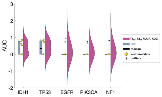 Gliomas exhibit a spectrum of genetic alterations that vary depending on their grade and specific subtype [48], with significant prognostic implications extensively studied [49]. IDH1 mutations, producing the oncometabolite 2-HG that disrupts cell differentiation and influences tumor behavior, are commonly found in lower-grade gliomas and certain glioblastomas [50], reflecting their distinct metabolic profile. Alterations in EGFR and mutations in TP53, which modulate glucose uptake and metabolism and disrupt glycolysis and oxidative phosphorylation, span various glioma grades [51,52,53]. This study obtained excellent AUC scores for IDH1, TP53, and EGFR, aligning with existing literature and underscoring the interplay between these genetic markers and metabolic pathways in glioma heterogeneity. Figure 5 presents the ROC curves for these three markers, using T1W, ADC, and T2W-FLAIR MR contrast combination. The distribution of AUC scores for each of these ROC curves over all 10 iterations is depicted in Figure 6. Given that the WES analysis on most of the subjects’ tumor samples yielded no mutations for EGFR, PIK3CA, and NF1 (Table S2 in the Supplementary Materials), the kernel density distribution is more concentrated near the median (0). This underscores the potential benefits of a larger number of biopsy samples to balance the extensive imaging data and enhance the reliability and robustness of the model’s predictive abilities.