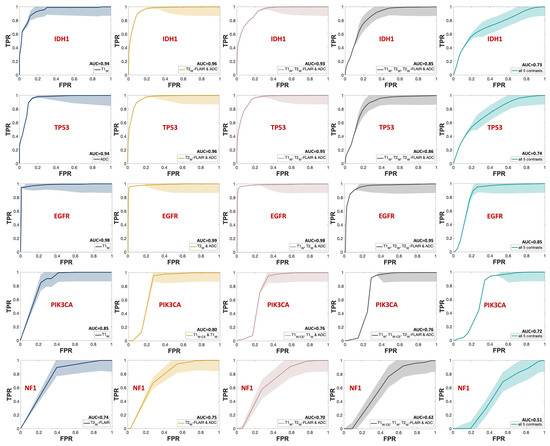 ROC curves of the MRI contrast combinations with the highest mean AUC scores in each group for predicting each mutation status. The SEM uncertainty bands are indicated with the same but lighter color for each graph. Each row is dedicated to one mutational target, starting with IDH1. Navy represents single contrasts, mustard for double contrasts, pink for triple contrasts, smoke for quadruple contrasts, and teal indicates quintuple contrasts. The mean AUC score for each curve is indicated next to the predictors’ names in the legend for each mutational target.