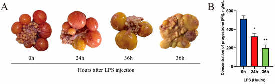 Ovarian morphology was observed and photographed, and it was found that follicles at different stages of development were present in the ovaries of geese; the morphology of hierarchical follicles changed considerably with increasing LPS treatment time. No significant changes in the morphology of the hierarchical follicles were observed after LPS treatment for 0 h. After LPS treatment for 24 h, the hierarchical follicles in some geese (3/5) became deep yellow in appearance and irregular ellipses or were round. After LPS treatment for 36 h, the hierarchical follicles of all geese (5/5) turned dark yellow and were irregularly elliptical in appearance, and the yolk became gelatinous (Figure 1A). This resulted in difficulty in separating the follicular membrane layer from the granular layer. Interestingly, there was no significant change in the appearance of pre-hierarchical follicles during this process, indicating that the response of hierarchical follicles to LPS stimulation was much higher than that of pre-hierarchical follicles. In addition, serum P4 concentrations were significantly higher in geese with normal follicular appearance than in geese with degenerated follicles and negatively correlated with the time of LPS treatment (Figure 1B).