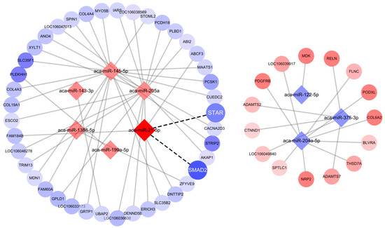 To investigate the mechanism of miRNA involvement of LPS on P4 secretion in GCs, ten highly expressed DEMs were selected as candidate genes for biological function validation (Table 1). Target gene prediction was performed using the bioinformatics prediction software miRDB and miRanda (Table S3). In addition, mRNA transcriptome sequencing was performed, and the target genes were predicted. The miRNA–mRNA interaction networks were constructed to identify their specific biological functions (Figure 3). The findings indicated that miR-21 initial sequences is a widely conserved aspect in human, mouse, rat, chicken, and pig (Figure 4A), and miR-21 has a 7mer-m8 conserved binding site with goose SMAD2 (Figure 4B). miRNA and mRNA sequencing results showed that miR-21 expression was higher in HF than DF, while the target genes SMAD2 (Figure 4C) showed a contrasting trend with higher miR-21 expression. This result is consistent with the expression pattern of miRNAs. Combined with KEGG in Figure 2D, the steroid hormone synthesis-related pathway was enriched. Therefore, miR-21 was selected for functional validation.