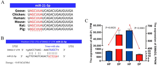 SMAD2 mRNA were predicted as target genes of miR-21. (A) Comparison of miR-21 initial sequences (marked in red) of different species. (B) Highly conserved 7mer-m8 binding site (marked in blue) of miR-21 and SMAD2 among multiple organisms were predicted by miRanda. (C) Comparison of expression levels of miR-21 and SMAD2 in the HF and DF RNA sequencing. Data are presented as mean ± SEM, n = 3.