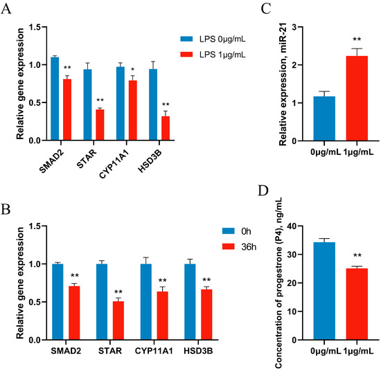 In animal experiments, the expression of P4-related genes in ovarian function were determined. The experimental results showed that LPS significantly down-regulated the expression of SMAD2 and P4 production-related genes STAR, CYP11A1, and HSD3B1 (Figure 5A). Next, primary GCs were treated with 1 μg/mL of LPS, and gene expression was reduced after 12 h of LPS treatment, showing the same results as in vitro experiments (Figure 5B). Accordingly, the secretion of P4 was significantly decreased after LPS treatment, and the concentration of P4 in the supernatant of the cell culture medium was significantly decreased by ELISA (Figure 5C). Meanwhile, LPS significantly increased the expression of miR-21 in vitro, further confirming the sequencing results (Figure 5D).