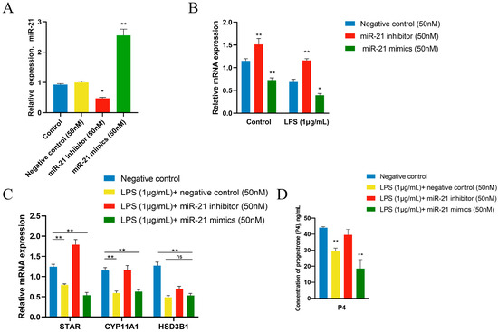 3.6. miR-21 Was Involved in LPS Regulation of P4 Synthesis in GCs