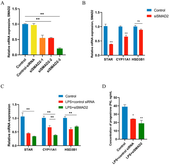 SMAD2 is necessary in P4 synthesis. GCs were treated for 12 h with vehicle control or 1 μg/mL of LPS after 36 h transfection with siRNA of SMAD2 (50 nM). (A) Comparison of transfection efficiency of different siSMAD2. (B) The mRNA expression of key genes related to steroid synthesis in GCs after transfection. (C) The mRNA expression of key genes related to steroid synthesis in LPS-treated GCs after transfection. (D) The concentrations of P4 in LPS-treated GCs after transfection. Data are presented as mean ± SEM, n = 9. *, p < 0.05; **, p < 0.01. ns, not significant.