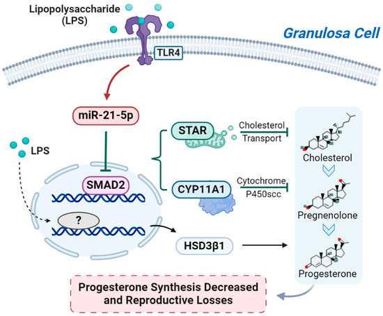 The miR-21/SMAD2 pathway is involved in LPS inhibit progesterone (P4) production in granulosa cells (GCs). The question mark represent currently unknown LPS-interacting genes.