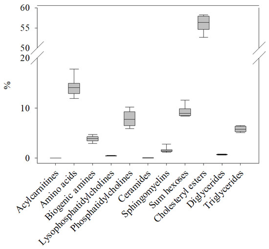 Relative occurrence of metabolites in the 11 compound classes (Table 1) included in the AbsoluteIDQ® p400 HR kit in the plasma metabolome of healthy control salmon (C0). The sum of concentrations for the metabolites in each class was normalized to the total concentration of all metabolites determined in the same sample. The box plot shows the variation and median value for all metabolites within that compound class in n = 8 samples.