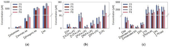 Significant differences associated with the infection state of the salmon were found for several biogenic amines (spermidine, putrescine, taurine), aromatic (phenylalanine), and glucogenic amino acids (aspartate, glycine, serine, methionine), and the sum of amino acids at W5 and W8 (Figure 2a). Notably, the concentrations of several amino acids (alanine, proline, tyrosine) and branched-chain amino acids (leucine, isoleucine, and valine) were already significantly changed at W2 (data not shown). Regarding the plasma lipids, the PRV-1 infection led to a considerable decrease in the plasma concentrations of free lipid molecules at W5 and W8 (Figure 2b,c). A more detailed analysis of the lysophosphatidylcholine (LPC) subclasses revealed that very-long-chain fatty acid (VLCFA)-LPC and polyunsaturated fatty acid (PUFA)-LPC were considerably decreased both in P5 and in P8 relative to their controls. Furthermore, the virus infection had a major effect on the ceramide and unsaturated diglyceride levels at the two time points.