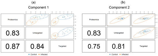 The optimized DIABLO model for the salmon metabolomics and proteomics data contained two components (Figure 7). The calculated correlation values of both component 1 and component 2 were in good agreement with the outcome of the PLS2 fitting, showing a strong correlation across the three datasets. The result also confirmed that the initial values for the DIABLO matrix were accurately derived from PLS2. The first component of the optimized model was sufficient to discriminate between the plasma contents of control and PRV-1-infected salmon (Figure 7a), matching the ideal outcome of the model. Interpretations were accordingly based on the variables identified as discriminant for component 1. Component 2 (Figure 7b) indicated variables that contributed to the separation within the two treatment groups, including the time aspect, which was confirmed as of minor importance for the differentiation between infected and healthy fish.