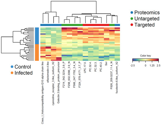 The multi-omics profiles of the significant variables in component 1 in each sample showed a clear clustering with regard to the two treatment groups (Figure 8). All proteins, with the exception of fucolectin-6, had increased plasma levels in the PRV-1-infected salmon, whereas the different lipid metabolites and serine were decreased.