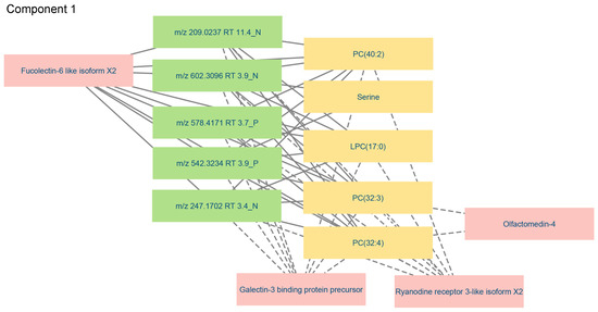 Several of the variables identified as discriminant in the multi-omics analysis had already been shown to be important in the targeted metabolomic analysis, specifically PC(32:3), PC(32:4), and SDMA (Figure S1a,b). The variables of interest in the untargeted metabolomics block were tentatively annotated in silico [34] (Table 4). Among the identified metabolites were ADMA and serine, which had also been found to be decisive in the targeted metabolomics dataset. Interestingly, three of the most relevant variables determined in the proteomics block, e.g., galectin-3-binding protein, fucolectin-6, and ryanodine receptor-3, had been identified as potential biomarkers for PRV-1 infection and HSMI development in our recent proteomics study [36].