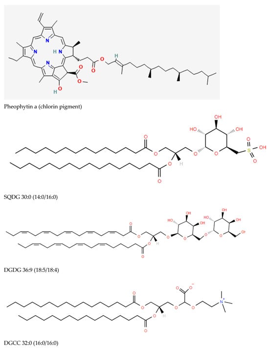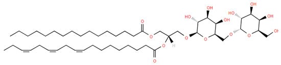 - Sulfoquinovosylmonoacylglycerols (SQMG) and sulfoquinovosyldiacylglycerols (SQDG) ([3,4,5]; Figure 1), which are sulfonolipids localized to the thylakoid membrane of chloroplasts functioning in the maintenance of photosystem II (PSII) [6,7,8]. Other possible functional roles include the regulation of DNA synthesis [9] and stimulation of glycosyltransferases involved in monohexosyldiacylglycerol (MHDG) and dihexosyldiacylglycerol (DHDG) synthesis [10].