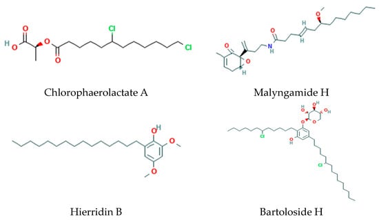 - Abt, K.; Castelo-Branco, R.; Leão, P.N. Biosynthesis of Chlorinated Lactylates in Sphaerospermopsis sp. LEGE 00249. J. Nat. Prod. 2021, 84, 278–286. [Google Scholar] [CrossRef] [PubMed]