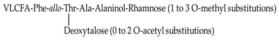 - Hsu, F.F.; Pacheco, S.; Turk, J.; Purdy, G. Structural determination of glycopeptidolipids of Mycobacterium smegmatis by high-resolution multiple-stage linear ion-trap mass spectrometry with electrospray ionization. J. Mass Spectrom. 2012, 47, 1269–1281. [Google Scholar] [CrossRef] [PubMed]