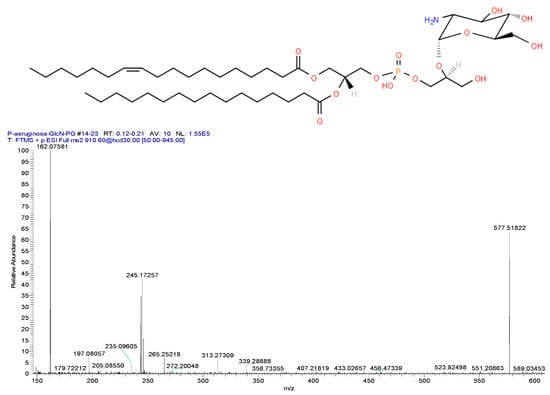 - Abbes, I.; Rihouey, C.; Hardouin, J.; Jouenne, T.; De, E.; Alexandre, S. Identification by mass spectrometry of glucosaminylphosphatidylglycerol, a phosphatidylglycerol derivative, produced by Pseudomonas aeruginosa. Rapid Commun. Mass Spectrom. 2018, 32, 2113–2121. [Google Scholar] [CrossRef] [PubMed]