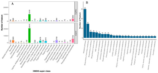 The HMBD superclass (A) and KEGG pathway (B) analysis of detected metabolites and top 30 associated metabolic pathways in positive and negative ionic modes, respectively.