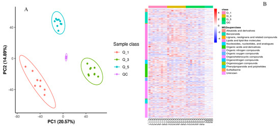The quantification analysis of identified metabolites by PCA analysis (A) and heatmaps (B) for different groups (red = Q_1, green = Q_3, and blue = Q_5).