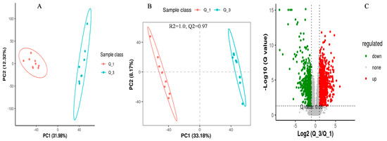 The comparative discriminated metabolomics plotting ((A) = PCA plot, (B) = PLSDA plot, and (C) = volcano plot, respectively) for the Q_1/Q_3 groups.