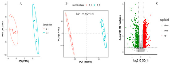 The comparative discriminated metabolomics plotting ((A) = PCA plot, (B) = PLSDA plot, and (C) = volcano plot, respectively) for the Q_1/Q_5 groups.