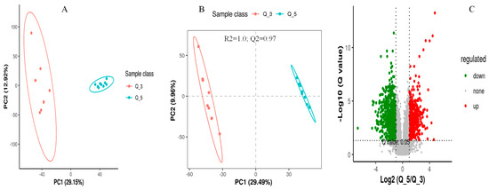 The comparative discriminated metabolomics plotting ((A) = PCA plot, (B) = PLSDA plot, and (C) = volcano plot, respectively) for the Q_3/Q_5 groups.
