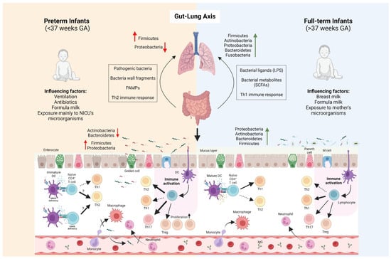 Preterm birth affects approximately 11% of births worldwide [1] and can either occur spontaneously or be induced by infections or pregnancy complications that require cesarean delivery. Premature neonates are classified as extremely preterm (<28 weeks of gestational age, GA), very preterm (28–32 weeks of GA), and moderate to late preterm (32–37 weeks of GA) [2]. Premature births result in impaired intestinal physiology and immune deficiencies, including lymphopenia, altered balance of Th1/Th2 responses, increased Th17 and Treg populations, and reduced numbers of neutrophils and NK cells accompanied by dysfunctional dendritic cells. Such changes create an immune system incapable of mounting adequate immune responses. Moreover, preterm infants are hospitalized for the first days in the neonatal intensive care units (NICU), where they receive antibiotics, are often fed with formula-based milk, and have limited exposure to the mother’s microbes [3]. All these factors make the gut more susceptible to disrupted colonization, represented by potentially pathogenic facultative anaerobic Gammaproteobacteria and strict anaerobes [4], putting the infants at a major risk of developing enteric infections. The gut microbiota also modulates immune responses in the airways via the “gut–lung axis” [5], and gut dysbiosis in early life may lead to an increased incidence of developing pulmonary disorders later in life [6].