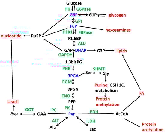 Gluconeogenesis is the production of glucose from precursors downstream of pyruvate in the metabolic network, and requires four alternative enzyme-catalyzed reactions to those of glycolysis, namely PC and PEPCK, which catalyze the conversion of pyruvate to PEP via OAA; F1,6 bisphosphatase, which converts FBP to F6P; and G6P phosphatase, which concerts G6P to glucose, which can be readily exported from the cell via glucose transporters. Usually, the full gluconeogenic pathway is active in the liver and kidneys [138], which helps maintain systemic glucose homeostasis by converting (mainly) lactate and alanine to glucose, though other glucogenic amino acids can also be used, at the cost of metabolic energy [138,139,140,141,142,143]. However, in the tumor microenvironment, glucose is often highly depleted, leading to low concentrations [144,145,146], which contributes to the flux control at the transporter level (see above). As glycolysis provides several anabolic precursors required for cell proliferation (see above), low glucose availability can impact a cell’s survival and ability to divide [147,148]. Further, cancer cells can express PC [34,149] and PEPCK (PCK) [150,151] and suppress FBPase [152] and also take up lactate as fuel [35,62,153]. Thus, lactate, Ala, and other glucogenic amino acids can provide carbon for the anabolic precursors which require bypassing the PK-catalyzed step to trioses like 3PGA (serine/glycine/1-C pathway needed for purine biosynthesis) and G3P (lipid biosynthesis) as well as the PPP (F6P + GAP), HBP (F6P), and if FBPase is active, also G6P for the oxidative branch of the PPP (Figure 1).