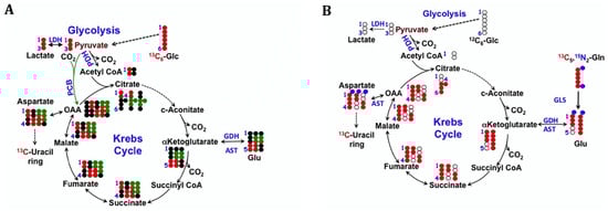 Isotopomer evolution in the Krebs Cycle. Acetyl CoA produced by oxidation of [U-13C]-glucose-derived pyruvate (PDH) may enter the Krebs cycle and label intermediates 2 carbon atoms at a time. Acetyl CoA may also be exported from the mitochondria as citrate, when ATP citrate lyase converts the cytoplasmic citrate to OAA + AcCoA, which is used for fatty acid synthesis and acetylation reactions. Anaplerosis from Gln via glutaminase and transaminases and/or from pyruvate carboxylation also contributes carbon to the TCA cycle intermediates, leading to complex isotopomer patterns as increasing numbers of cycles are traversed. (A) 13C6 glucose plus unlabeled Gln. Black dots are 12C. 13C6 glucose (red dots) produces 13C3 pyruvate which can enter the Krebs cycle either via PDH as a 2-carbon unit via acetyl CoA or a 3-carbon unit via PCB (green dots), which give rise to different isotopomers of Krebs cycle intermediates and anabolic products such as uracil and its precursor Asp, which are distinguishable by NMR as 13C-1,2 and 13C-3,4 Asp via PDH in the forward direction, and 13C1,2,3 Asp via PCB. (B) 13C5,15N2 Gln plus unlabeled glucose. Open black circles are 12C. Red dots are 13C atoms from Gln; blue dots are the amino and amido nitrogen atoms of Gln. The anaplerotic input of fully labeled Gln produces the fully labeled Krebs cycle intermediates starting from 2OG via glutaminase and GDH or aminotransferases. Fully labeled OAA from Gln condenses with glucose-derived AcCoA to produce quadruple-labeled citrate, which becomes triply labeled 2OG via the Krebs cycle and doubly labeled succinate. AST will transaminate OAA with Glu, transferring the amino nitrogen to Asp. Unlabeled glucose produces the partially labeled 2OG and subsequent metabolites with scrambling at the succinate-to-fumarate step. The isotopomers produced evolve in further cycles and differ with other inputs to the cycle. Detailed isotopomer analysis is needed to disentangle the effects such as with TCAsim [29]. LDH: lactate dehydrogenase; PDH: pyruvate dehydrogenase; PCB: pyruvate carboxylase; GLS: glutaminase; GDH: glutamate dehydrogenase; AST: aspartate aminotransferase (also glutamate-oxoglutarate aminotransferase, GOT). From Figure 2 of Lane and Fan (2017) [65].