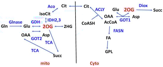 2OG is a hub metabolite with several fates in both the mitochondria and the cytoplasm. Mitochondrial 2OG may derive from IDH activity in the TCA (Aco + IDH2,3), which is reversible depending on substrate and redox ratios; interconversion to 2HG via specific dehydrogenases or variant IDH2; transamination of Glu via GOT2, from Gln via glutaminase; and oxidization to citrate and then OAA via the TCA. In the cytoplasm, citrate is cleaved to OAA + AcCoA, which itself has numerous fates including fatty acid synthesis; OAA may transaminate with Glu (via GOT1) producing 2OG, which is a co-substrate for 2OG-dependent dioxygenase (Diox). Enzymes in blue: Glnase glutaminase; GDH: glutamate dehydrogenase; GOT2: glutamate OAA transaminase 2; IDH2: NADP-dependent isocitrate dehydrogenase; IDH3: NAD-dependent isocitrate dehydrogenase; TCA: tricarboxylic acid cycle; Aco: aconitase; ACLY: ATP-dependent citrate lyase; FASN: fatty acid synthase; GOT1: glutamate OAA transaminase 1; Diox: 2OG-dependent dioxygenase (numerous).