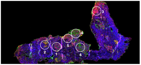 Tissue heterogeneity in lung cancer tissue. This slice (10 μm thickness) was stained for cancer (panCK, green), CD8- (T cells, red), and CD68- (macrophages, yellow) expressing cells and DAPI (localizing nuclei, blue). Different regions (circled) were analyzed by transcriptomics, whole slices by SIRM using 2H Glucose + 13C,15N Gln and analyzed by NMR and ultra-high-resolution mass spectrometry. The circled regions of interest (100 μm diameter, numbered 1–6) were further analyzed for the protein expression level of 58 different markers of cancer and immune cell functional states using oligonucleotide-barcoded antibodies using the NanoString Digital Spatial Profiling system. From Figure 4C of Fan et al. [44] under creative commons https://creativecommons.org/licenses/by/4.0/ (accessed on 1 May 2024).