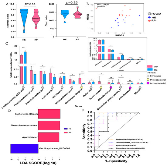 After removing chimeras and low-quality sequences, 1,029,680 valid tag sequences were obtained, with an average of 51,484 high-quality gene sequences per sample for follow-up analysis. A total of 7576 ASVs were obtained. The two groups of samples shared 2797 ASVs, and 2554 and 2225 ASVs were identified in the HE and RP groups, respectively (Supplementary Material Figure S1). When the sequencing depth was 10,000, the sparse curve was stable, indicating that the sequencing quality was good and that it had a certain depth and representativeness (Supplementary Figure S2). Alpha-diversity analysis showed no significant differences in the Shannon and Chao1 indices between the HE and RP groups (p > 0.05) (Figure 1A). Beta-diversity analysis showed significant non-metric multidimensional scaling separation between the HE and RP groups (p < 0.05) (Figure 1B).