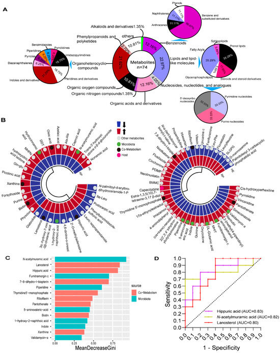 Differential metabolites were screened using VIP > 1 and p < 0.05 as the criteria (Supplementary Table S4). In total, 74 significant differential metabolites were identified between the HE and RP groups in the positive and negative ion modes. Using the HMDB database (https://hmdb.ca/, accessed on 25 June 2024), the 74 significant differential metabolites were classified. These metabolites were mainly organoheterocyclic compounds (21.62%), organic oxygen compounds (10.81%), lipids and lipid-like molecules (22.97%), nucleosides, nucleotides, and analogs (4.05%), benzenoids (12.16%), organic acids and derivatives (12.16%), others (10.81%), phenylpropanoids and polyketides (2.70%), alkaloids and derivatives (1.35%), and organic nitrogen compounds (1.35%) (Figure 2A). Heat maps showed that 41 differential metabolites were increased, while 33 were decreased in the feces of the HE group compared with those of the RP group (Figure 2B). The sources of these differential metabolites were determined using MetOrigin (http://metorigin.met-bioinformatics.cn/home/, accessed on 25 June 2024) (Figure 2B). These metabolites included one host metabolite, nine bacterial metabolites, nine host–bacterial co-metabolites, and 55 other metabolites. The random forest model ranked 19 valuable differential metabolites in descending order of importance, showing only the top 15 metabolites (Figure 2C). Subsequently, these metabolites were analyzed using the ROC curve (Supplementary Table S5). The area under the curve (AUC) of all metabolites was >0.75, and the AUC of N-acetylmuramic acid, lanosterol, and hippuric acid was >0.80 (Figure 2D). We selected N-acetylmuramic acid as a potential early-warning marker of RP in dairy cows based on the Gini index and AUC.