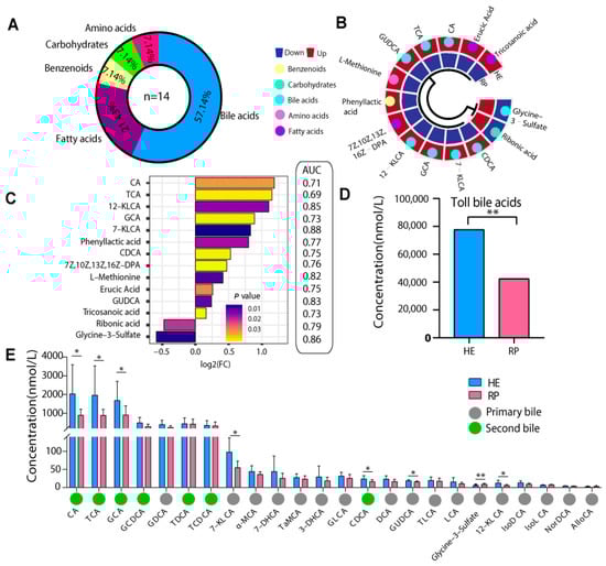 Differential serum metabolites between the HE and RP groups. (A) The hollow pie chart represents the class ratio of 14 differential metabolites. (B) The clustering heatmap of the significantly different metabolites in the plasma of the dairy cows between the HE and RP groups. (C) Histogram of log2FC and p value of differential bile acids between the HE and RP groups. (D) The bar chart represents the abundance of total bile acids in the HE group and RP group. (E) The bar chart represents the relative abundance of different bile acids in the plasma of cows in the HE group and RP group. Blue and pink represents the HE and RP groups, respectively. * p < 0.05, ** p < 0.01. CA, cholic acid; CDCA, chenodeoxycholic acid; GCA glycylcholic acid GUDCA, glycine ursodeoxycholic acid; 7-KLCA, 7-ketolithocholic acid; 12-KLCA, 12-ketolithocholic acid; TCA, taurocholic acid.