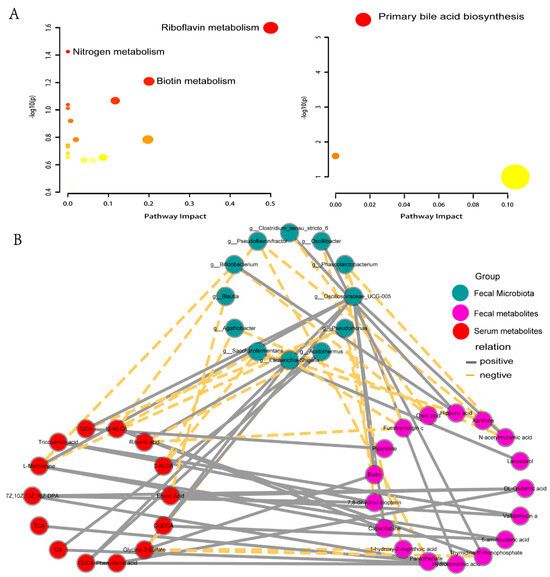 Kyoto Encyclopedia of Genes and Genomes (KEGG) metabolic pathway enrichment analysis of differential metabolites was performed using the MetaboAnalyst 5.0 analysis platform. Eighteen metabolic pathways were enriched in differential metabolites in feces, with significant changes in the riboflavin metabolism and nitrogen metabolic pathways (Figure 4A, left) (p < 0.05). The 14 differential metabolites screened in plasma were enriched three metabolic pathways, mainly involving primary BA biosynthesis (Figure 4A, right) (p < 0.05).