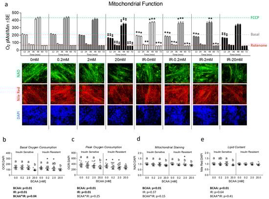 Effect of 6-day BCAA treatment with and without insulin resistance on mitochondrial function and content. (a) Time trial of mitochondrial function (Seahorse Mitostress assay) following treatment of myotubes with BCAA 2:1:1 (leucine/isoleucine/valine) at varied concentrations (0, 0.2, 2, or 20 mM normalized to leucine content) for 6 days with and without insulin resistance (IR). (b,c) Basal and peak mitochondrial function following removal of non-mitochondrial respiration and normalization to nuclei content (Figure S1), respectively. (d) Mitochondrial staining following treatment as described in “a”. (e) Lipid staining following treatment as described in “a”. Notes: For the time trial in “a”, a three-way repeated measures ANOVA with time as the lone repeated measures factor was used to analyze the data with Bonferroni’s correction to correct for multiple comparisons. ‡ Indicates p < 0.05 versus control group within the same level insulin sensitivity for the time trial and * indicates p < 0.05 between insulin-sensitive and insulin-resistant cells at the specified BCAA concentration. The gray dashed line in panel “a” represents the value of the insulin-sensitive control group at measurement 3 (18 min) as basal oxygen consumption for comparison across all groups. The green dashed line in panel “a” represents the value of the insulin-sensitive control group at measurement 9 (54 min) as FCCP-induced peak oxygen consumption for comparison across all groups. The red dashed line in panel “a” represents the value of the insulin-sensitive control group at measurement 12 (72 min) as rotenone-induced non-mitochondrial oxygen consumption for comparison across all groups. Images presented in panel “a” were captured using the 20× objective. Data in panels (b–e) were analyzed using two-way ANOVA with Bonferroni’s correction for multiple comparisons between individual groups. * Indicates p < 0.05 between insulin-sensitive and insulin-resistant cells at the specified BCAA concentration. Dissimilar letters indicate p < 0.05 between BCAA concentrations within the same level of insulin sensitivity.