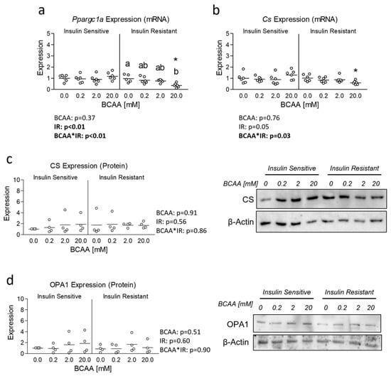 To follow-up our examination of mitochondrial function, we next assessed the expression of the primary regulator of mitochondrial biogenesis, peroxisome proliferator-activated receptor gamma coactivator 1-alpha (Ppargc1a). We observed a significant main effect of insulin resistance in the suppression of Ppargc1a expression, which showed pairwise difference between insulin-resistant cells and insulin-sensitive cells at 20 mM BCAA (Figure 3a). We also observed a significant interaction effect between BCAA and insulin resistance, which revealed suppressed Ppargc1a expression in insulin-resistant cells treated with 20 mM BCAA versus insulin-resistant cells treated without additional BCAA (Figure 3a). We next assessed the expression of citrate synthase (Cs), a downstream target of Ppargc1a and indicator mitochondrial content. We again observed a significant interaction effect with a significant difference between insulin-resistant cells treated with BCAA at 20 mM and its insulin-sensitive BCAA-matched counterpart (Figure 3b). Though unlike reduced Ppargc1a expression in insulin-resistant cells treated with 20 mM BCAA, no differences between BCAA treated cells within each level of insulin sensitivity were observed (Figure 3b). Interestingly, neither treatment condition altered expression of CS at the protein level (Figure 3c). Similarly, no difference in the mitochondrial protein OPA1 was observed (Figure 3d).