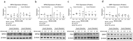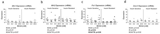 A consistent link between elevated branched-chain amino acids (BCAA) and severity of insulin resistance has been observed [,,,]. Evidence also exists that BCAA improve mitochondrial function [,,,], yet mitochondrial dysfunction is a proposed mechanism by which BCAA may promote insulin resistance. Previously, we assessed the effects of varied levels of BCAA both with and without concurrent insulin resistance and found BCAA at physiologically attainable levels did not inhibit mitochondrial function, and in fact, increased mitochondrial content []. Conversely, during insulin resistance, supraphysiological BCAA reduced mitochondrial function and related gene expression []. However, a limitation of our paper was the lack of exploration into the effect of BCAA with and without insulin resistance on mitochondrial dynamics. Insulin resistance has previously been linked to altered mitochondrial dynamics [,] and represents another therapeutic opportunity to improve insulin resistance [].