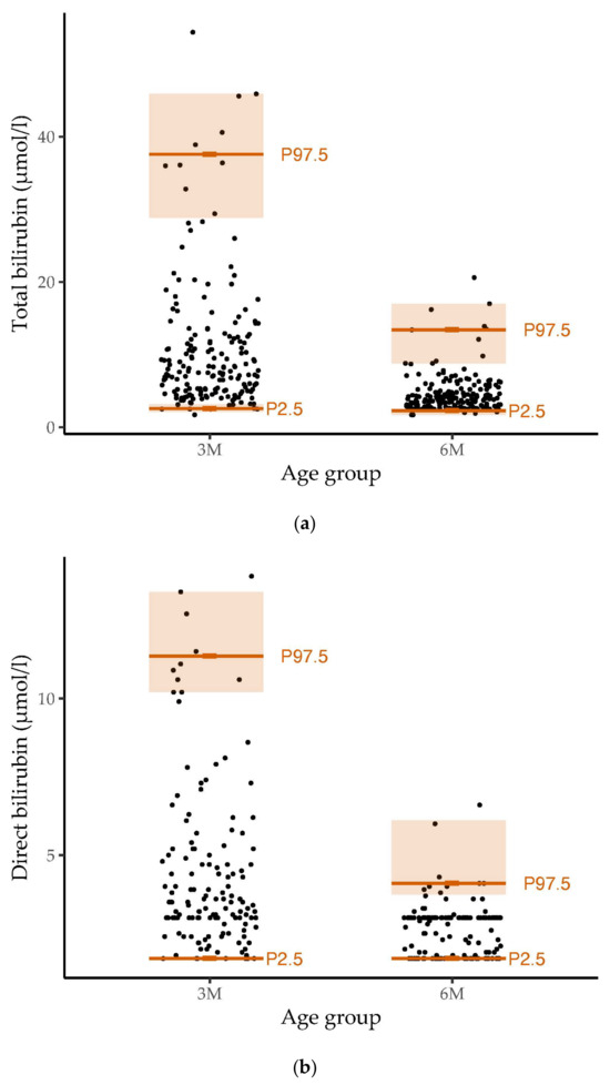In most studies, infants of different months of age were grouped to establish reference values for bilirubin [24,25,27]. Compared to a study in healthy three- and six-month-old infants from Helsinki, we found slightly higher 97.5th percentiles for total and direct bilirubin levels at three months of age and lower 97.5th percentiles for bilirubin values at six months of age. However, the 2.5th percentiles for bilirubin were similar [26].