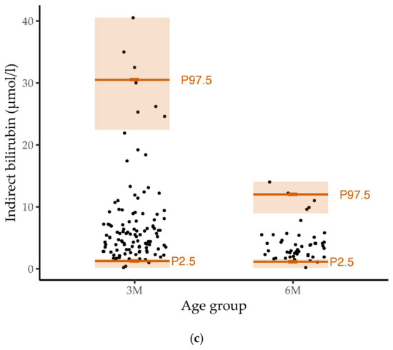 Distribution and reference ranges of (a) total (n = 376), (b) direct (n = 290) and (c) indirect (n = 161) bilirubin values in our healthy study population of infants at the age of three and six months. Dots represent the distribution of measured bilirubin values. The 2.5th percentile (P2.5), 97.5th percentile (P97.5) and the 95% confidence interval are marked in orange The reference ranges for bilirubin at the age of three months were wider than those at six months of age.