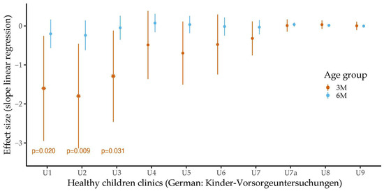 Associations between total bilirubin levels at three and six months of age and body weight during healthy children clinics (German: Kinder-Vorsorgeuntersuchungen) stratified by age and adjusted for sex. The association between bilirubin levels measured at three months of age and body weight is depicted in orange. The association between bilirubin levels measured at six months of age and body weights is depicted in light blue. Effect sizes were determined by linear regression analyses. The error bars show the 95% confidence intervals. Associations with statistical significance are marked. In general, total bilirubin levels were negatively associated with body weight. Statistical significance was reached for the associations between total bilirubin levels at three months of age and weight at healthy children clinics after birth (U1), third to tenth day after birth (U2) and fourth to fifth week after birth (U3).