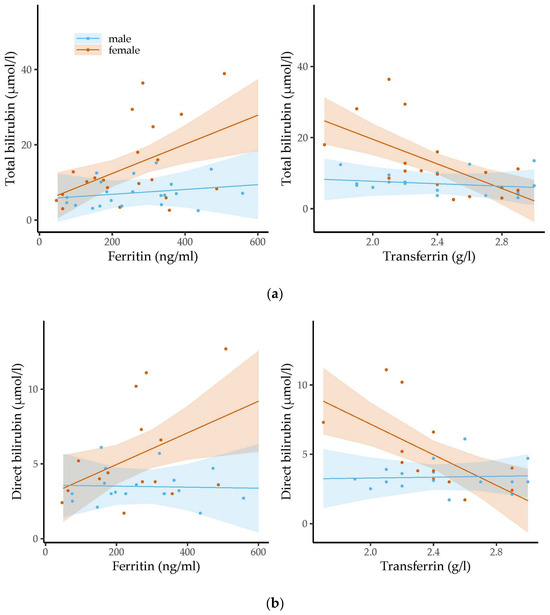 In contrast to these studies, we did not find any sex-specific differences in hemoglobin, ferritin and transferrin concentrations. Nevertheless, statistically significant associations between bilirubin levels and levels of ferritin or transferrin were only observed among girls. We assume other factors may influence the relation between bilirubin levels and the levels of iron parameters. For instance, sex hormones, nutrition and body composition also appear to affect erythropoiesis, iron metabolism and bilirubin concentrations [45,50,51,52,53,54].