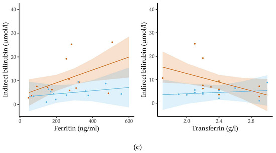 The associations between the levels of ferritin/transferrin and concentrations of (a) total bilirubin, (b) direct bilirubin and (c) indirect bilirubin were assessed stratified by sex in three-month-old infants using linear regression analysis. Dots represent the individual measurements. The semi-transparent background shows the confidence region of the associations. Levels of iron-related parameters were related to bilirubin levels in girls but not in boys. Whereas ferritin levels were positively associated with the levels of the three types of bilirubin, transferrin concentrations were inversely related to bilirubin concentrations.