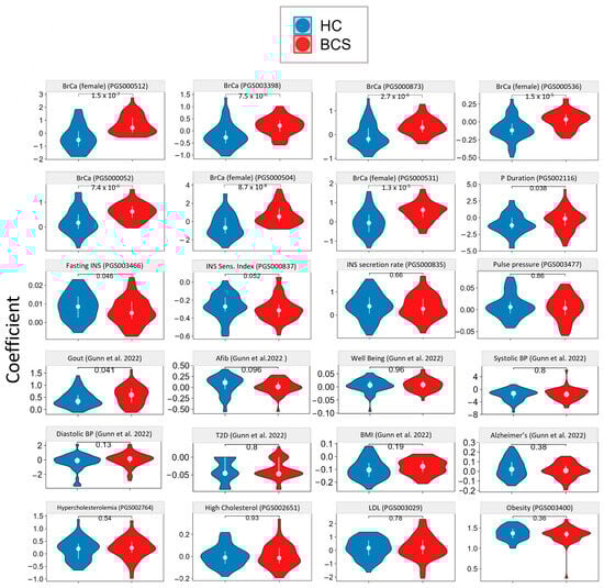 Whole genome sequencing (WGS) was completed for each participant in both cohorts. Using these data, we applied multiple polygenic risk score (PRS) calculations to the cohort in order to understand their genetic predisposition for health and disease. PRS categories included breast cancer (108 scores), lipid (65 scores), insulin (23 scores), cardio (47 scores), and general health and disease (54 scores) []. These were assessed for a total of 297 individual scores. The complete results for BrCa-specific PRSs are reported in Appendix B (Table A1), with selected PRSs for BrCA and other disease signatures shown in Figure 2.