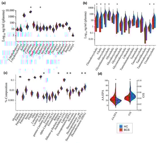 Targeted Metabolomics. Split violin plots showing BCS on the left (red) and HC on the right (blue) with individual analytes of each type plotted on a Log10 scale. (a) Acylcarnitines (ng/mL); (b) Bile Acids (ng/mL); (c) Fatty Acids (% composition); (d) AA:EPA Ratio (arachidonic acid:eicosapentaenoic acid) and Omega-3 Index. * Wilcoxon Rank-Sum Test between-groups p-value < 0.05.