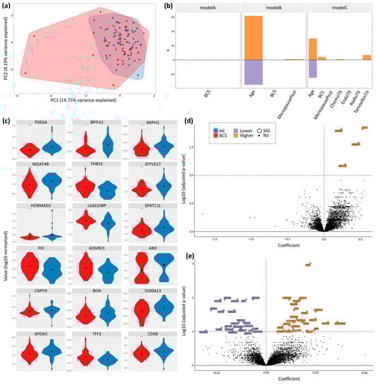 Untargeted Proteomics. (a) PCA of BCS Serum Proteomics (lognormal filtered, by type, SD = 0.5); (b) Univariate and Multivariate Models (q < 0.1): Model A—BCS Status; Model B—BCS status, age, and menopause status; Model C—BCS status, age, menopause status, and treatment type; (c) BCS vs. HC: significantly different proteins (after multiple hypothesis correction; log10 normalized); (d) Volcano plot of Model C by BCS status; (e) Volcano plot of Model C by age; ** and *** Wilcoxon Rank-Sum Test p-value < 0.01 and p-value < 0.001, respectively. Note: Gene names are used for brevity, however, all findings in this figure refer to gene products (proteins).