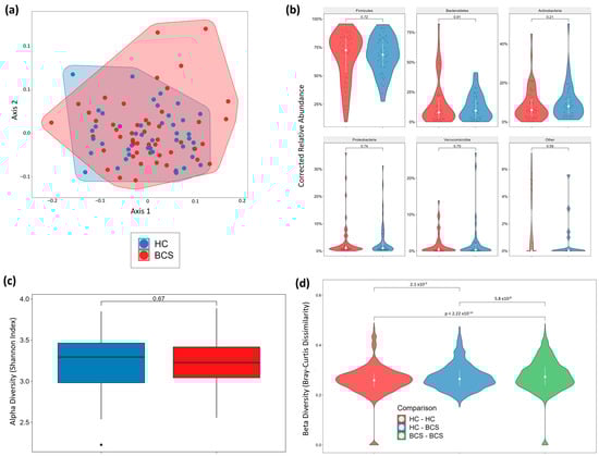Gut Microbiome Metagenomics I. (a) PCoA, (b) Phylum Distribution, (c) Alpha diversity (Shannon index), (d) Beta Diversity (Bray-Curtis Dissimilarity).
