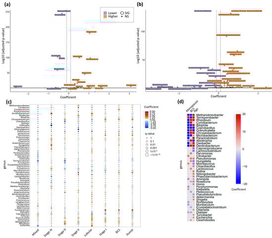 Gut Microbiome Metagenomics II. (a) genus volcano plot of BCS vs. HC; (b) species volcano plot of BCS vs. HC; (c) significant genus grouped by stage at diagnosis and BrCa subtype; (d) genus corrected for menopause and age.