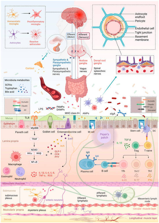 Distinguished from other peripheral organs, the gut possesses an intrinsic complete nervous system, namely the ENS, with extensive regulation of gastrointestinal motility, mucus secretory, gastrointestinal endocrine, epithelial permeability, immunologic, and inflammatory responses []. The ENS comprises enteric neurons and enteric glia cells, forming two main plexuses, the submucous (or Meissner’s) plexus between the circular muscle layer and the muscularis mucosa, innervating the muscle motor, and the myenteric (or Auerbach’s) plexus between the longitudinal and circular muscle, responsible for secretory and absorptive control. Neurons of the ENS can be classified by function into intrinsic primary afferent neurons (IPANs), interneurons, motor neurons, and intestinofugal neurons (IFN), or by morphology, mainly into Dogiel type I and type II neurons [,]. In general, primary transmitters in enteric neurons include acetylcholine (Ach), serotonin (5-HT), nitric oxide (NO), substance P, vasoactive intestinal peptide (VIP), and calcitonin gene-related peptide (CGRP). The myenteric neurons are mostly cholinergic or nitrergic, while submucosal neurons are mainly cholinergic neurons or VIP-expressing noncholinergic neurons []. Beyond the neurotransmitters, enteric neurons as well as enteric glia may also produce cytokines, such as IL-18, colony stimulatory factor 1 (CSF1), and transforming growth factor-β (TNF-β). Therein, IL-18 is necessary for the AMPs production of goblet cells to defend against pathogens, including Salmonella typhimurium []. TNF-β also plays an essential role in muscularis macrophages’ development and maintenance, indicating the intimate association between enteric nervous systems and barriers, as well as immune function [,].